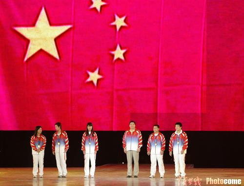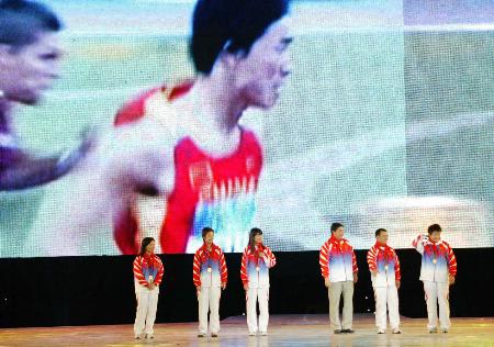 更大的驚喜引燃了全場的歡呼——杜麗、王義夫、張怡寧、張國政、王旭、陳艷青6位在本屆奧運會上勇奪金牌的選手,風塵仆仆地趕來,與祖國各地的大學生一同分享青春運動盛會的歡樂。