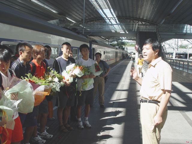 我校副校長侯光明率部分師生到車站站臺歡迎健兒歸來。