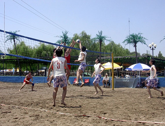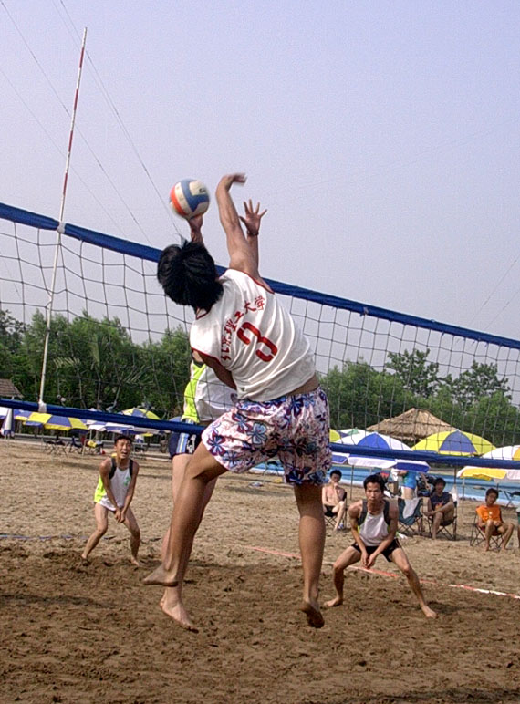 沙灘排球運動近年來因其技術多變,觀賞性高而受到青睞。本次比賽是推廣大學生排球運動的一個新的嘗試,受到了眾多高校的重視和支持,男子乙組共有七支隊伍參賽,都是室內比賽的佼佼者。我校派出了主攻手車雪,接應張若松,翟崎,副攻付旭東,二傳胡欣的高快結合的陣容,平均身高在1米85以上,具有明顯的網前優勢。由于采用雙敗淘汰制,要求選手一天中至少打5場比賽,加上天氣炎熱,日曬強烈,比賽中隊員們克服了諸多困難,配合默契,團結一致,戰術靈活,每球必爭,充分發揚了拼搏精神,展示了理工大學選手的風采。