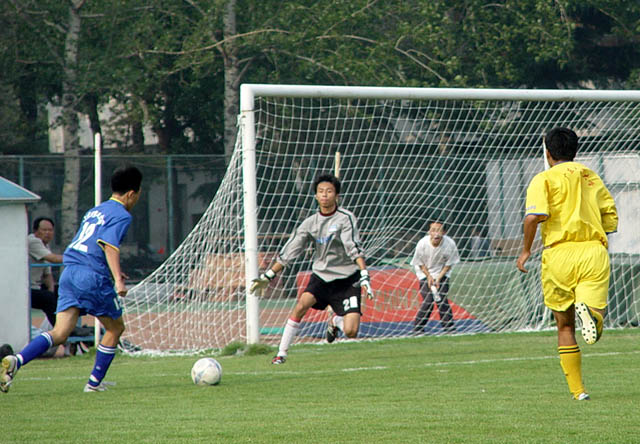 北理隊(duì)員吹響了進(jìn)攻的號(hào)角,22分鐘,12號(hào)孫磊左路傳中,8號(hào)袁微的沖頂,球滑門(mén)而出,驚出了廣工防守隊(duì)員一身冷汗,但這僅僅是開(kāi)始,24分鐘,19號(hào)石俊斌前插將球推給14號(hào)隊(duì)員王旭,廣工門(mén)將的及時(shí)出擊才化解了險(xiǎn)情。這一波勝似一波的進(jìn)攻在第30分鐘的時(shí)候再次結(jié)果,北理21號(hào)隊(duì)員唐斌帶球長(zhǎng)途奔襲,突破了對(duì)方幾名防守隊(duì)員之后,晃過(guò)最后一道守門(mén)員的關(guān)卡,推球入網(wǎng),2:0。