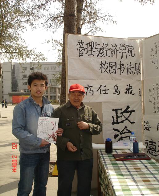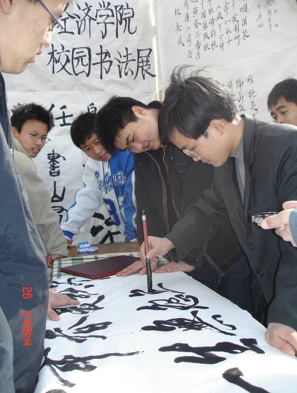 3月26日下午,陽光明媚,春意正濃,在中心教學樓與東操場之間的空地上,長桌、展板,宣紙、毛筆,墨水在陽光下閃爍它深邃的光輝,一群同學圍在一起現場揮作,以書法的藝術感召力和具有豐富內涵的文字表達著心聲。這就是管理與經濟學院文藝部舉辦的“校園書法展”的展示現場。