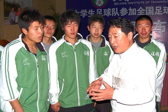 我校大學生足球隊主教練金志揚與隊員們在一起。