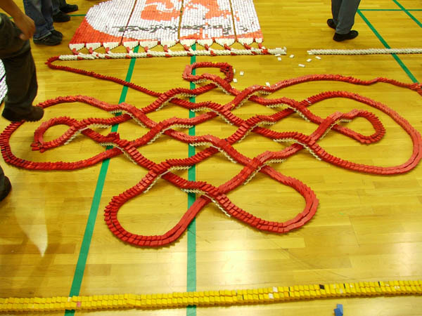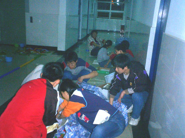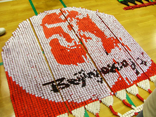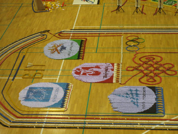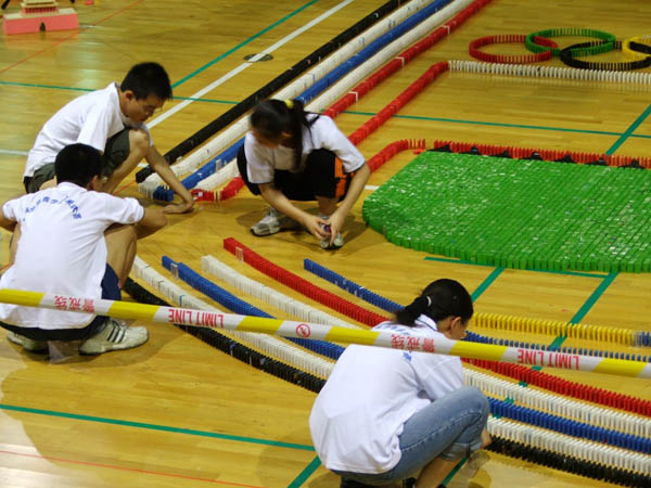 我校參賽代表隊在校團委組織下,由付玉良等9名同學(xué)組成。在校學(xué)生會、校研究生會、光電創(chuàng)新基地、機電航模隊老師、同學(xué)的大力支持下,經(jīng)過近兩個月的準(zhǔn)備訓(xùn)練,經(jīng)過20小時的精心碼牌,終于完成最后的參賽作品。當(dāng)5萬張骨牌一氣呵成全部倒下的瞬間,全場響起最熱烈的掌聲。