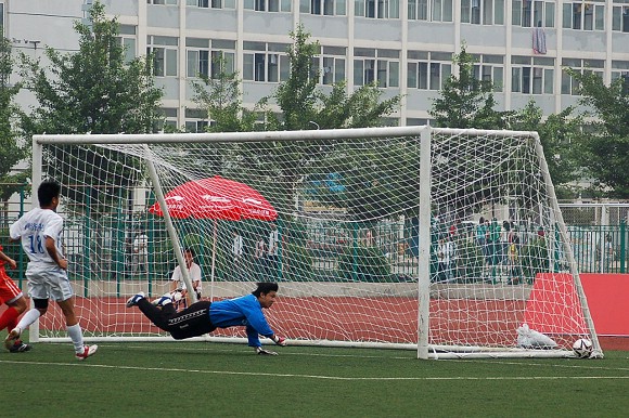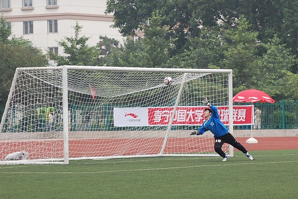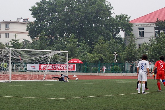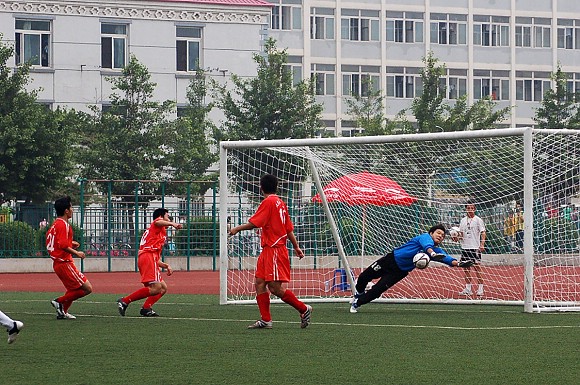 過于猛烈的進(jìn)攻并沒有敲開對方的大門,由于全部隊(duì)員過于壓上,反而使同濟(jì)大學(xué)足球隊(duì)在第10分鐘的一次防守反擊中獲得了點(diǎn)球的機(jī)會(huì)。我校足球隊(duì)守門員18號王毅飛身救球,這次角度非常之刁的點(diǎn)球竟然被王毅擋出門外從而化險(xiǎn)為夷,這給了全體隊(duì)員們極大的鼓勵(lì),大家在加強(qiáng)防守的基礎(chǔ)上繼續(xù)向?qū)Ψ酱箝T猛攻。