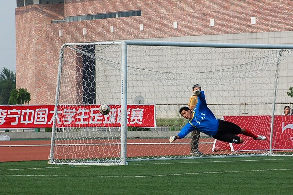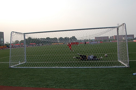 在緊張而又激烈的點球大戰(zhàn)中,我校足球隊率先罰球,且五射五中,而東華大學足球隊雖也三罰三中,但在罰第四輪點球時,罰球隊員高度緊張,猶豫不決,射出點球低平偏正且力道不足,我方守門員王毅判斷準確將球撲出,對方的第五輪罰球已無必要。最終我校足球隊以總比分6:4力克勁敵東華大學,從而在重新奪回大學生足球聯(lián)賽冠軍的道路上掃平了一個重要障礙。
