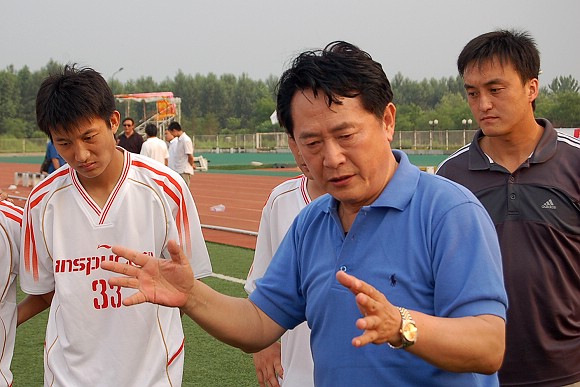 中場休息時,總教練金志揚在向隊員們做戰(zhàn)術指導,勉勵隊員一定要敢打敢拼,爭取把勝利保持到最后時刻。