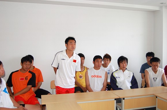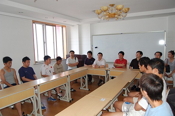 7月8日上午,在2005~2006李寧中國大學生足球聯賽的冠亞軍決賽比賽前,我校足球隊在駐地召開了賽前動員會,校黨委副書記、副校長楊賓,前來為校足球隊加油助威的相關學院、部處領導與全體教練員、運動員參加了會議。