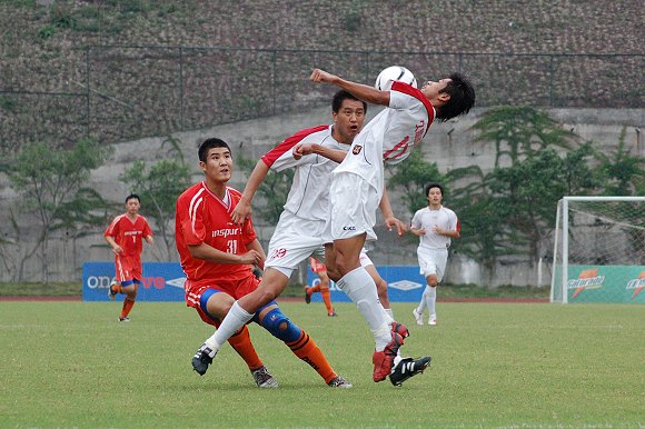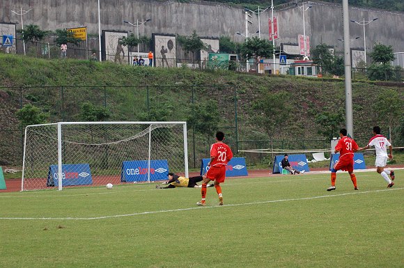而天津火車頭隊(黃色隊服)則1-0小勝麗江東巴(白色隊服)同樣闖進半決賽。