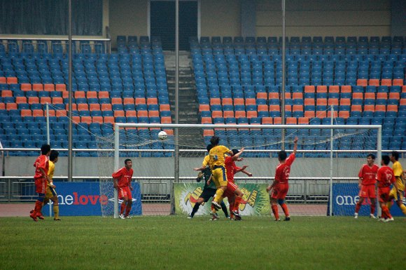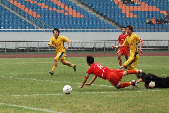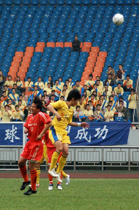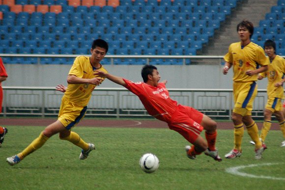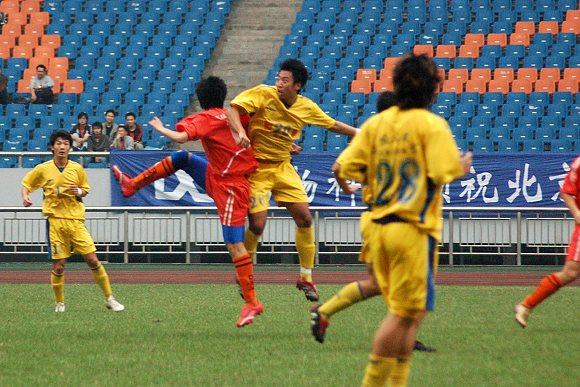 天津火車頭隊也充分利用了這點優勢,頻頻采用長傳沖吊和定位球的打法,終于在上半場第35分鐘找到了一次機會,利用角球吊入我方門前,其場上身高接近2米的后衛將球頂入球門左上死角,打破了場上的僵局。