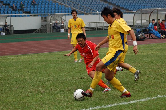 開場前的蒙蒙細雨和陰霾的天空使得現場氣氛異常緊張,畢竟這是關系到兩支隊伍誰能沖進中甲的關鍵之戰,因此比賽剛剛開始就似乎進入了白熱化,曾兩度交手的雙方都按照自己的思路全力以赴,在球場的每一寸土地上相拼。