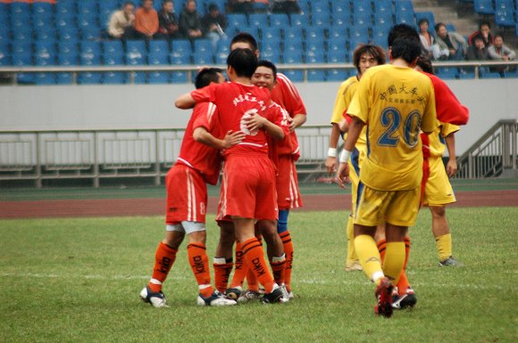 北理工的幾名球員興奮地抱在一起慶祝這來之不易的進球。
