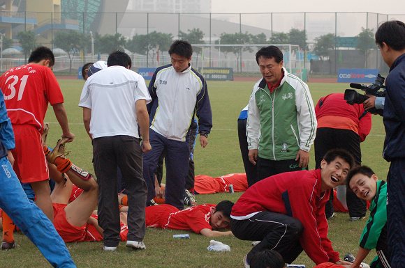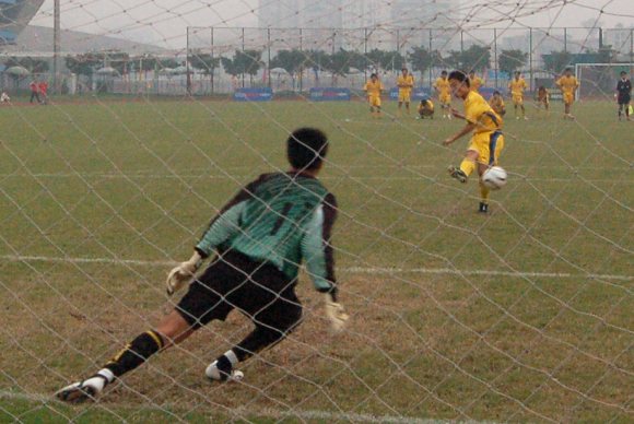 點球決戰異常殘酷,前五輪罰球,雙方各射失一球,開始進入單輪罰球決勝后,雙方又都各進一球。罰球進行到了第七輪時,對方隊員似乎想聲東擊西,但在巨大的壓力之下動作變形,竟然將球打飛,只要我方再進一球,就將創造歷史。
