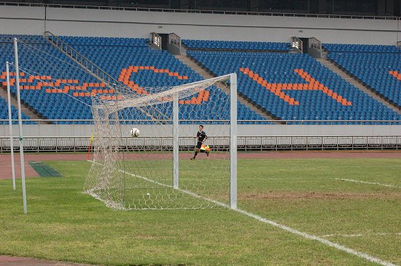 這時我校足球隊點球專家6號于飛正好拍馬趕到,一腳勁射,差點將球網射破!