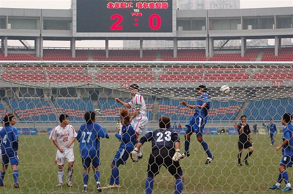 上半場第30分鐘,北理工隊員頭球射門,球竟然打在橫梁上彈出,令人惋惜。