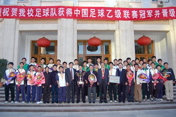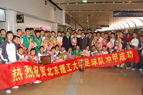 2006年11月4日(周六)14:30,獲得2006年中國足協(xié)乙級聯(lián)賽冠軍并沖甲成功的我校足球隊順利從重慶飛抵首都機場,黨委副書記趙平攜師生員工代表前往機場熱烈歡迎。