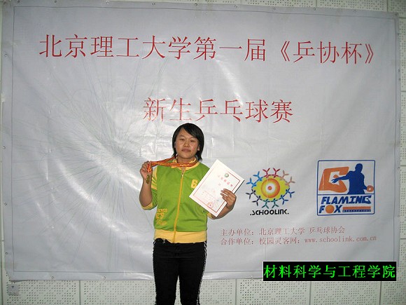 材料科學(xué)與工程學(xué)院04310601班王美娜同學(xué)勇奪北京理工大學(xué)第一屆新生乒乓球賽冠軍