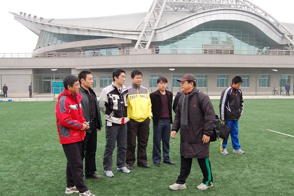 金志揚(yáng)主教練在向測(cè)試裁判組成員介紹球隊(duì)冬訓(xùn)備戰(zhàn)情況。