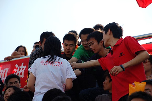 賽場的圍網上懸掛著“一方有難、八方支援”、“眾志成城、抗震救災”的紅色橫幅標語,雙方球員手持標語“讓我們共同面對災害”、“讓我們共同渡過難關”的紅色橫幅標語,表達了全國人民此時此刻的心情。