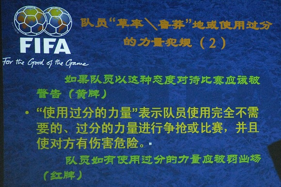 中國足協根據國際足聯的最新規定特別強調,今年將對犯規動作以“草率”、“魯莽”和“使用動作過大”三類標準來判罰:“草率”的犯規將不會出牌,“魯莽”則會被出示“黃牌”,“使用動作過大”則被直接出示紅牌。這一標準的出臺,在中超和中甲的賽場上,已經給在某些不太注意自己動作的球隊身上體現,他希望北理工的球員們充分理解這條規則,也提前給自己打上了“預防針”。
