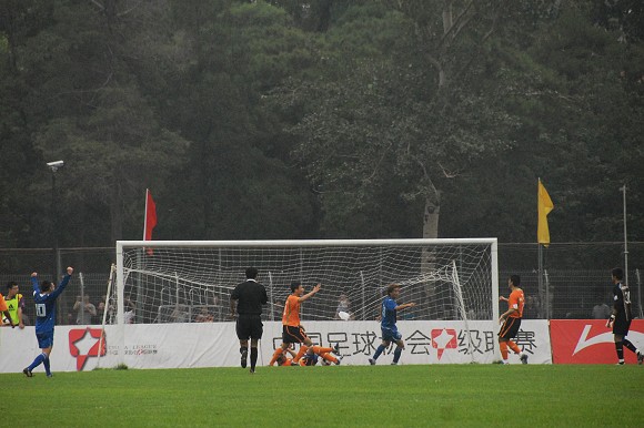 第19分鐘,煙臺毅騰再次獲得機會。煙臺隊中路配合直傳北京理工隊身后,皮球被張淼一蹭但是沒有將球處理干凈。7號咸濤在禁區內拿球直接轉身盤過張淼傳中,禁區內北理工隊門將孫程將球打出,大禁區外后插上的煙臺隊隊員起腳打門,皮球擦著立柱滑出底線。