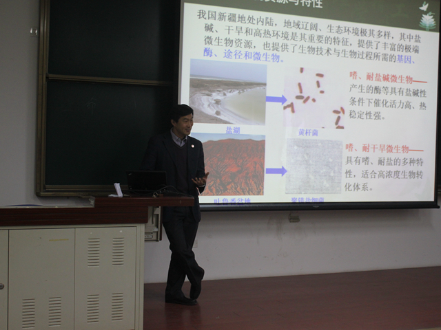 隨后,李春教授向大家說明極端微生物資源與特性,以新疆某些極端環境微生物為切入點,介紹了極端微生物的主要類型以及它們各自的特性,而這些特性是挖掘新基因非常好的渠道。同學們聽得十分認真,紛紛邊聽邊詳細地做好筆記。關于如何應用這些資源來促進科學技術的發展,李教授從三個層面提出了自己的看法:其一,是基于酶層面的催化轉化。其中包含磷脂酶實現植物油高效脫膠、甘油脫水酶實現甘油快速轉化及葡糖醛酸苷酶實現甘草酸定向生物轉化。其二,是基于細胞層面上的代謝轉化。其中包括基因元件的挖掘與表征、耐熱底盤宿主、酵母細胞內合成木糖醇的途徑構建與優化及甘草酸前體的生物合成。其三,是基于種群層面上的協同轉化。在講解這三個方面時,李教授詳略得當,語言幽默風趣,使原本嚴肅端正的學術性講座氣氛活躍了許多。