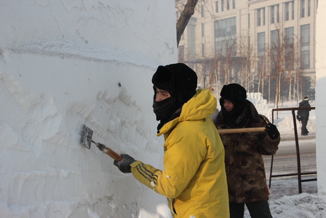 冬天的哈爾濱特別寒冷,白天溫度在零下20度左右,晚上的溫度接近零下30度。孫飛回憶說:“去年我跟著孩子們到哈爾濱參賽,我只要外出二十分鐘,頓時(shí)冷得發(fā)抖。”今年的哈爾濱和往常一樣寒冷干燥,在冰雪世界里同學(xué)們不顧嚴(yán)寒地勞作,即使凍僵了手,凍傷了臉,睫毛上結(jié)滿冰晶,大家依然在開心地忙碌著。