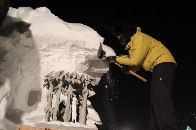第二天進(jìn)行的工作是基礎(chǔ)造型,對作品中的竹葉、小鳥等細(xì)部進(jìn)行雕刻,在塑形過程中發(fā)現(xiàn)不合理的地方,同學(xué)們還要隨時(shí)修改、隨時(shí)調(diào)整。制作雪雕的過程是一個(gè)做減法的過程,因此塑形的過程面臨著各種困難,其中最大的困難是注意力必須要非常集中,絕不能有絲毫差錯(cuò),若雪塊一旦雕錯(cuò),就無法重新再來。在初期雕刻竹葉時(shí),同學(xué)們估算錯(cuò)了葉子的承受能力,竹葉出現(xiàn)了斷折的情況,而唯一的補(bǔ)救方法就是在原有基礎(chǔ)上縮小竹葉的盡寸重新雕刻。精雕細(xì)刻見匠心,長達(dá)十多小時(shí)的連續(xù)工作中,同學(xué)們戴了兩層手套的手凍到?jīng)]有知覺,手套一次次地濕透又一次次被寒風(fēng)吹干。雕磨到一半時(shí),同學(xué)們發(fā)現(xiàn)手中的工具開始變鈍,這時(shí)隊(duì)員李雨璇和蔣亦希兩位女生自告奮勇地表示要前去找磨刀鋪將工具打磨鋒利。這是哈爾濱四點(diǎn)半的天空,但仿佛已像是深夜,在人生地不熟的異鄉(xiāng),兩位女生扛著沉重的鐵器開始四處尋找磨刀鋪。三個(gè)小時(shí)后,她們終于成功將磨利的刀子交到同伴們的手上。垂垂夜幕,陰霾天空,同學(xué)們還在馬不停蹄地趕工,事實(shí)上雪雕制作中的很多工作是只能在晚上進(jìn)行,夜晚時(shí)雪的粘度會(huì)因?yàn)闇囟冉档投龃螅@為雪雕細(xì)節(jié)的修改和塑性創(chuàng)造了有利的條件。可是晚上的氣溫特別低,同學(xué)們往往工作一會(huì)兒就凍得渾身發(fā)抖,只能靠照明燈泡發(fā)出的熱量取暖、烘烤手套。夜晚回到宿舍,大部分同學(xué)累得倒頭就睡,這時(shí)隊(duì)長周谷川悄悄地拿起熱水瓶下樓為同學(xué)們打洗腳水,這一幕被細(xì)心的李曉龍看到了。第二天當(dāng)李曉龍想起幫助同伴們打水時(shí),發(fā)現(xiàn)暖瓶已經(jīng)被周谷川搶先拎走了。事實(shí)上,這種“我為人人,人人為我”的事情每天都在發(fā)生,參賽的每個(gè)同學(xué)都看在眼里,感動(dòng)在心里。