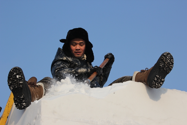 第三天,任務(wù)依然很繁重,比賽進(jìn)入了白熱化階段,看著其他代表隊(duì)的作品也逐漸成形,同學(xué)們的心里既緊張又激動(dòng)。在雕刻過程中,周谷川隊(duì)長看到女生坐在雪上進(jìn)行雕刻時(shí),毫不猶豫地就把自己的帽子摘了下來,讓女生們坐在帽子上工作。遇到一些需要精雕細(xì)琢的部位,李雨璇和蔣亦希兩位女生常常整個(gè)身體趴在冰上工作,整個(gè)雕刻過程她們始終保持著一絲不茍、精益求精的態(tài)度,絲毫沒有叫冷叫苦。事后兩個(gè)女生甚至自我調(diào)侃道:“我們都是女漢子中的‘女漢子’啊!”