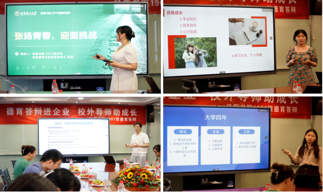 德育答辯環節,每位學生依次上臺,通過PPT展示的形式,從思想品德、理想信念、專業學習、人際交往、就業實習、社會實踐等多個角度對大學學習生活進行總結和反思,陳述大學期間的收獲和成長,分享學習方法和經驗,審視自己大學四年的成長歷程、思想轉變以及對未來的美好憧憬。彭明雪、呂飛、郝麗姝、徐秋華、班主任孫士偉、輔導員王娟對同學們四年來的成長進步給予充分肯定,對存在的不足提出意見建議,并給予鼓勵和職業規劃指導。