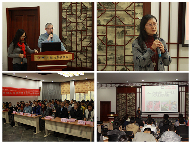 2015年11月10日,北京理工大學機械與車輛學院2015年度康明斯林慰梓博士獎學金頒獎儀式在中關村校區車輛重點實驗樓報告廳舉行。出席本次頒獎儀式的有北京福田康明斯發動機有限公司黨委書記詹振京、北京福田康明斯發動機有限公司人力資源部總監范慧嫻、北京福田康明斯發動機工廠廠長 DES 、ISG 發動機技術總工周卉、機械與車輛學院黨委書記左正興、獎學金評審委員會主任郝佳馨以及北京福田康明斯發動機有限公司的其他嘉賓。