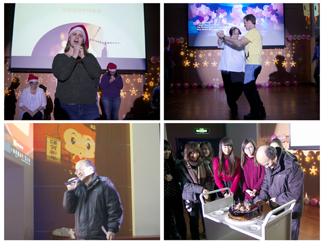 第一環節到此結束,可愛的外籍教師隨后進行中場表演。外教們用默劇形式演繹新年歌曲,現場反響熱烈,掌聲連連。接著,黨委書記陳大明深情演繹了一首《氧氣》,曲調溫和,時而轉音,可謂一曲震驚四座,全場同學掌聲雷動。隨著一個生日蛋糕的緩緩推出,晚會進入高潮:為所有12月20日后出生的外國語學院的同學集體慶生。生日歌唱起,陳書記現場給大家分蛋糕,其樂融融,宛如一家,帶給大家無限的溫暖與感動。
