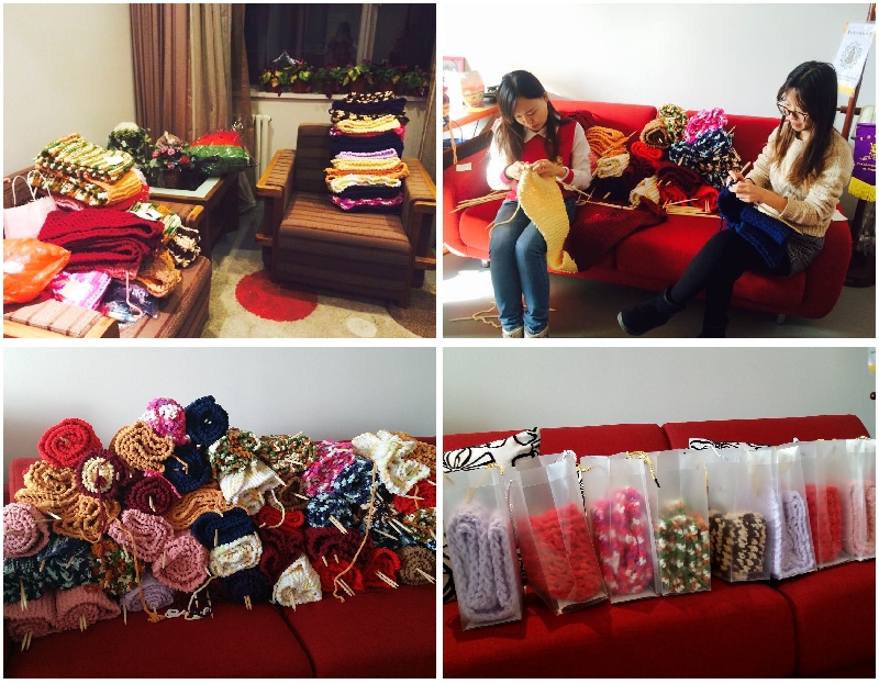 一個(gè)月后,一條條暖心圍脖陸續(xù)完成。失獨(dú)小組于12月16日開(kāi)始進(jìn)行回收工作。同學(xué)們滿懷期待,將親手編織的“作品”交到心理與社會(huì)工作實(shí)驗(yàn)室來(lái),更有熱心的同學(xué)完成了兩條甚至更多的圍脖。僅僅3天的時(shí)間,收到的圍脖便堆積成山,載滿了同學(xué)們?cè)诤涠罩腥紵臒崆榕c愛(ài)心。失獨(dú)小組成員們仔細(xì)將一條條即將完成的圍脖收針?lè)饪冢R放置到一個(gè)個(gè)精心挑選的包裝袋中,將同學(xué)們的愛(ài)心以最美好的方式帶給新希望家園的老人們。