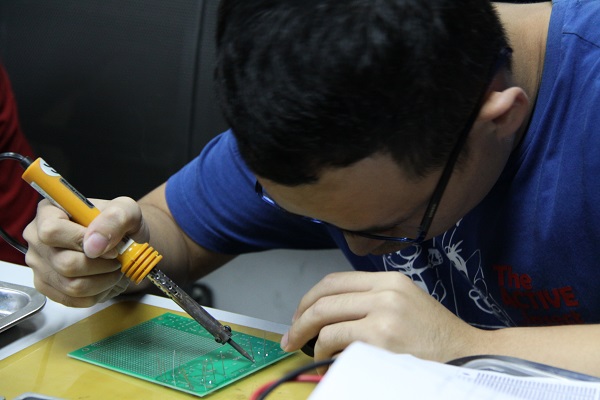 講解結(jié)束后,基地指導(dǎo)老師引導(dǎo)同學(xué)按次序領(lǐng)取實(shí)驗(yàn)器材,并逐一介紹各類工具的使用方法。因?yàn)槭堑谝淮螌?shí)驗(yàn)課的緣故,幾位老師極為耐心地帶領(lǐng)同學(xué)從頭焊接電路,隨時(shí)為有困難的同學(xué)提供幫助。完成焊接后,老師也預(yù)留了充分的時(shí)間供大家檢驗(yàn)電路,在調(diào)試電路的間隙,老師還教授了檢查電路失誤之處的技巧。在老師熱心的幫助,和同學(xué)們不懈的努力下,所有同學(xué)都焊接出令自己滿意的電路成品。