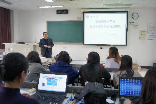 岳昌君教授圍繞“經(jīng)濟新常態(tài)下高校畢業(yè)生就業(yè)特點”,從宏觀經(jīng)濟背景、就業(yè)特點研究、教育質(zhì)量評價和就業(yè)趨勢分析四大方面做了詳細的講解。岳教授介紹了我國經(jīng)濟發(fā)展顯現(xiàn)出的新常態(tài),分析了經(jīng)濟發(fā)展階段與產(chǎn)業(yè)結(jié)構(gòu)的關系、與教育的關系,經(jīng)濟全球化時代需要全球化人才以及互聯(lián)網(wǎng)+時代高等教育改革的方向。他以北京大學教育學院承擔的“全國高校畢業(yè)生就業(yè)狀況”調(diào)查為例,從就業(yè)去向、就業(yè)落實率、就業(yè)分布、工作類型、起薪、總體滿意度、就業(yè)渠道、擇業(yè)意向、就業(yè)影響因素、就業(yè)流動等方面介紹了高校畢業(yè)生的就業(yè)特點。在高等教育質(zhì)量評價方面,岳教授從高校提供的學習條件和學生發(fā)展評價兩個角度做了全面的分析。最后,岳教授總結(jié)了當前全球工作特點變化的趨勢,耐心解答了同學們提出的問題。