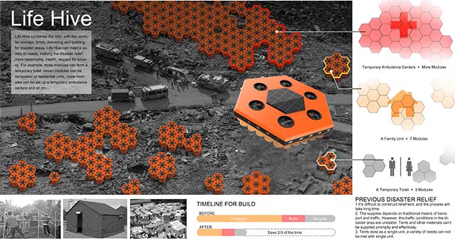 iF新秀設(shè)計(jì)大獎(jiǎng)(IF TALENT AWARD)的評(píng)選聚焦于當(dāng)前最重要的社會(huì)議題,收集有可能改變世界的創(chuàng)新想法,致力于尋找引領(lǐng)未來(lái)產(chǎn)品設(shè)計(jì)方向。 北理工設(shè)計(jì)學(xué)院郭萌睿、劉思維、劉冬、胡一帆四名同學(xué)的設(shè)計(jì)作品“LIFE HIVE”(蜂巢救災(zāi)無(wú)人機(jī)系統(tǒng))參與了四個(gè)類(lèi)型分組中的“新無(wú)人機(jī)服務(wù)”項(xiàng)目角逐,該項(xiàng)目要求探索發(fā)現(xiàn)無(wú)人機(jī)的新服務(wù)項(xiàng)目。作品要在“創(chuàng)新與精致”“美感”“責(zé)任”“功能”和“定位”五個(gè)方面都具有杰出的表現(xiàn),才能獲得該獎(jiǎng)項(xiàng)。