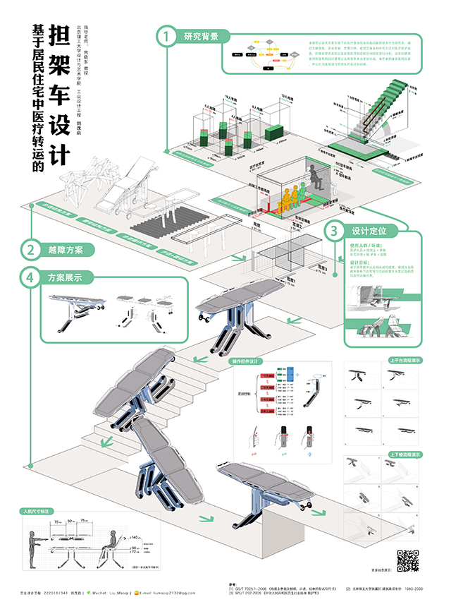 設計說明:基于居民住宅中醫療轉運的擔架車設計以居民住宅環境下的醫療急救所面臨的問題和需求作為研究點 ,通過對醫療救護服務、擔架車現狀以及建筑空間 限定進行分析,總結出使用者對擔架車的設計需求 以及擔架車本身受到環境、操作者的諸多限制因素 ,并以此為基礎進行擔架車的設計和創新。設計點主要有:1.對擔架越障原理的創新,擔架車越障結構將履帶式結構和步進式結構相結合,使擔架車能夠滿足居民住宅中多種環境條件的通行使用。2.對擔架車的支撐結構進行創新,設計了更加靈活的連接方式,為擔架車的功能實現提供更多可能性。3.結合新的結構和外觀造型,對擔架車的色彩使用進行創新,使用刺激性較弱的色彩為患者提供安全舒適的護理感受,提升對產品的信任感。