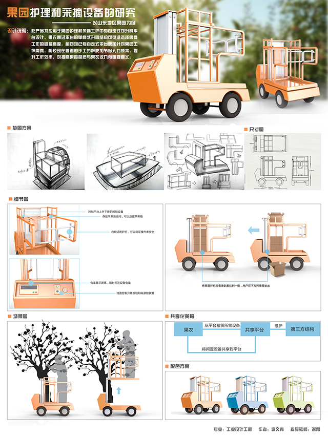 設計說明:本產品為以儲蓄電池作為動力源,在液壓驅動的輪式底盤上搭載的桅桿式裝置的升降平臺。通過整機結構的合理布置,使得整個作業平臺體積保持在合理范圍內,使其更容易在植株之間進行作業;具體考慮果農工作時的工作狀態,分析采摘時的工作方式,避免工作過程中的大幅度動作,減輕作業人員的疲勞;對于提升果農經濟效益,降低勞動強度,推動果園機械化的發展具有一定意義。