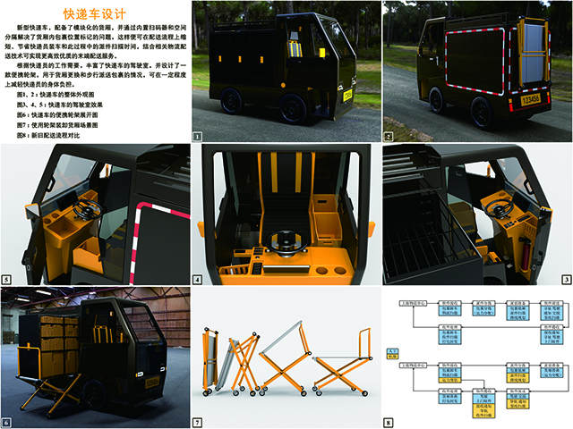 設計說明:1、組合式快遞車貨廂:考慮到貨廂裝卸和移動的方便性,結合最大裝載質量(180kg)、大件包裹的尺寸(1號郵政紙箱規格530*290*370mm)、人體肩寬尺寸(成年男性95%≤469mm)將快遞車貨廂劃分為3個模塊。每個模塊根據包裹的大小增設隔架,使貨廂與網點倉庫貨架能夠通用,并將掃碼器集成于貨廂,提升取放包裹的動作流暢性。2、更高效的裝卸貨方式:使用特別設計的輪架,通過替換貨廂的方式完成快遞車包裹的裝卸。3、快遞車的外觀內飾:根據快遞車短途高頻和司機上下車頻繁的行運特點、對快遞員的需求分析設計了快遞車的外觀和內飾。4、優化了快遞末端配送模式:建議將現行的分片區配送模式改為根據實時業務量分配運力的配送模式,充分發揮現有運力,并消除快遞員獲取勞動所得的“片區瓶頸”。