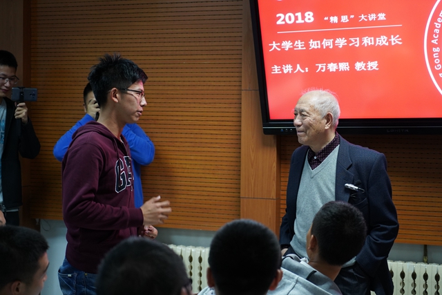 已經85歲高齡的萬春熙教授在歷時近2個小時的講座交流全程一直保持著矍鑠的精神,工作人員幾次請他坐下休息但都被婉言拒絕。深厚的理論功底、廣博的知識儲備、形象的語言表達,尤其是他對教育事業的赤誠和對青年學子成長成才由衷的期冀,深深的感染著在場的每一名師生。他表示,能與青年學子有這樣近距離的面對面交流,也是他的快樂之道,他愿和大家一路,在人生的大學里繼續努力學習,與青年學子成為同學。