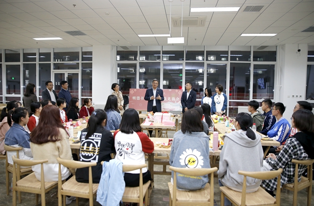 在生活組團食堂,明德、經管、知藝書院的同學們正在進行新生班級“見面會”。按照明德書院“八字八輩”的“字輩文化”,2020級是“惟”字輩,明德2004班學生正在為班級起班名,同學們激烈討論,集思廣益;與此同時,明德2008班將報到日10月9日定為班級的集體生日,正在共享生日蛋糕、共同慶祝。校長來到學生中間,坐下來與學生一同參加活動,對同學們積極建立班級文化表示了充分的肯定,校長講到:世界一流大學建設,不僅要講究科學技術,更要發揮人文關懷,提倡真善美;勉勵在場學生要好好學習、把自己培養成材,要為學校人文社科建設做貢獻,要將科學精神和人文情懷相結合,成長為“胸懷壯志,明德精工,創新包容,時代擔當”的北理人。