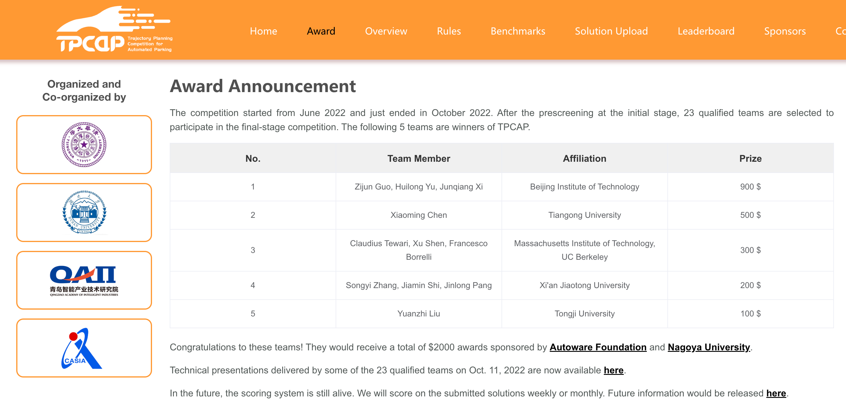 TPCAP是一項聚焦于泊車場景自動駕駛車輛軌跡規劃技術的全球線上比賽。該賽事依托第25屆IEEE智能交通系統國際會議(IEEE ITSC 2022)舉辦,由湖南大學、青島智能產業技術研究院、中國科學院自動化所、清華大學等單位組織承辦。賽事為業界與學術界研究人員提供交流平臺,促進自主泊車軌跡規劃技術的發展,引領高質量車載決策規劃系統開發的技術潮流。TPCAP自2022年6月上線以來,在全球范圍內累計吸引了來自24家高校、研究機構、企業的61支參賽隊伍,參賽單位包括麻省理工大學、加利福尼亞大學(伯克利分校)、路易斯安那州立大學、清華大學、北京理工大學、上海交通大學、浙江大學、復旦大學等國內外知名高校,以及上海浦江國家實驗室、滴滴出行等科研院所和企業。