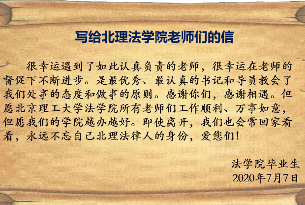 畢業生吳雨霖代表全體畢業生朗讀了“寫給老師的一封信”,信中同學們回顧了求學北理工法學院的美好時光,感恩師長的諄諄教誨。畢業生還通過“畢業生云電臺”表達對學院、老師、同學們的依依不舍之情。法學院老師們、學弟、學妹們也在云上為畢業生送上祝福,祝他們前程似錦,再創輝煌,常回“家”看看。