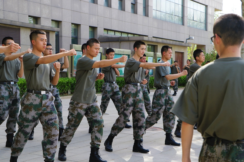 沖拳彈踢打出男兒本色,齊步正步更是豪氣沖天。國旗儀仗隊的同學們也加快了訓練步伐,晚訓時間更是延長至近十一點。當汗水揮灑在一百米的跑道上,當砸地聲一次次回蕩在校園上空,我們知道,他們在用一次次的練習踐行著“護衛國旗 高于生命”的信仰。