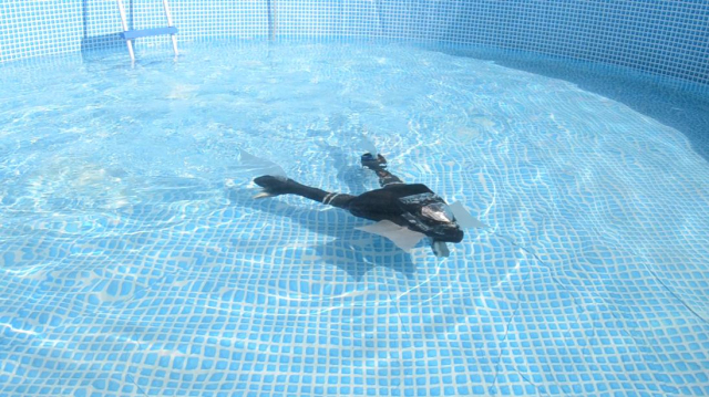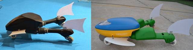 (黑色的是第一代兩棲蛙板機器人;花色的是第二代兩棲蛙板機器人。)
