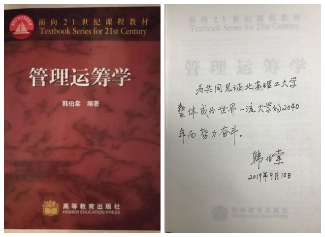 “今天,我將自己編寫的第一版《管理運(yùn)籌學(xué)》教材送給新入職的青年教師,同時(shí)也想跟你們做個(gè)約定,2040年,讓我們共同見(jiàn)證北理工成為世界一流大學(xué)!雖然,我知道這個(gè)擔(dān)子很重,但是我很有信心,寄希望予你們!當(dāng)然,我的擔(dān)子也很重啊,今年我已經(jīng)70歲了,到2040年,還有21年哪!但我有信心!我們都有信心!……”在2019年北京理工大學(xué)教師榮休儀式上,國(guó)家級(jí)教學(xué)名師韓伯棠教授真摯而動(dòng)人的寄語(yǔ),觸動(dòng)了在場(chǎng)每一位教師的心靈,感動(dòng)的眼淚與認(rèn)同的笑聲,一時(shí)間充滿了會(huì)場(chǎng),大家再次為“韓式幽默”所折服,也更為這位長(zhǎng)者的殷切期待而動(dòng)容。
